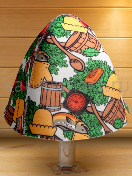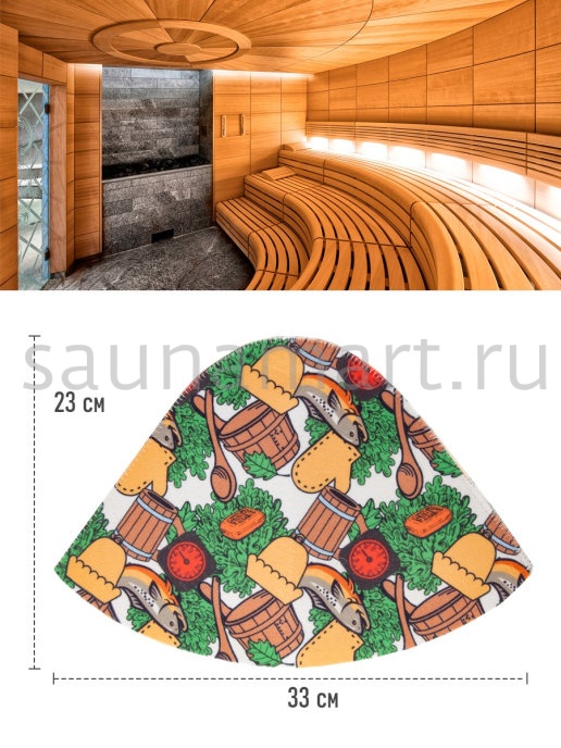 Шапка это необходимый атрибут для похода в баню или сауну. Высокая температура и сухой воздух в парной могут вызвать перегрев и ожоги кожи головы. Шапка для бани убережет голову, уши и волосы от высокой температуры и перегрева. Если пренебрегать защитой головы с помощью шапочки, то волосы теряют влагу и становятся ломкими и сухими. Помимо термоизоляционных свойств банная шапка обладает отличными гигроскопичными свойствами - прекрасно впитывает влагу и пот, что сделает Ваше пребывание в парной более комфортным. Головной убор для бани выполнен из натурального материала – войлок. Материал достаточно пористый, за счет чего создает своеобразный защитный барьер по принципу термоса, для изоляции от высокой температуры. Стильный, яркий, необычный рисунок выделит Вас и подчеркнет Вашу индивидуальность. После применения расправьте шапку и просушите. Размер универсальный. Мы предлагаем Вам не только эффективное средство защиты от перегрева, но и стильный яркий аксессуар для бани и сауны.