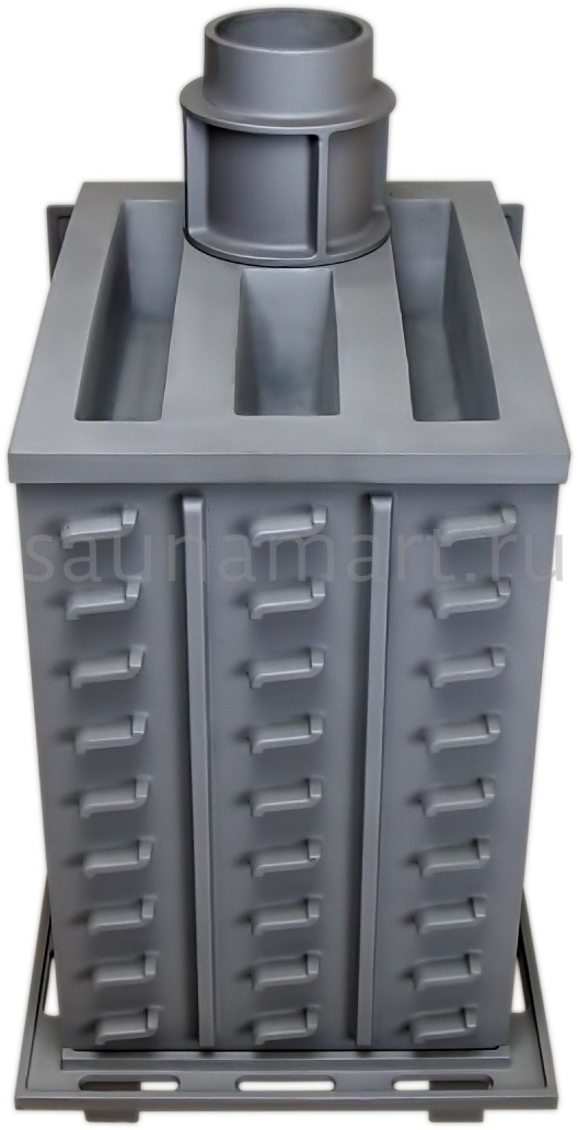 GFS-ЗК 25 (М) — это печь с усиленной каменкой большей массы, с единым углублением внутрь топки для дополнительной укладки чугунного заряда. Теплосъемные шипы, со стороны горения пламени, в разы увеличивают площадь соприкосновения огня с каменкой и ускоряют передачу тепла, а также способствуют лучшему дожигу, смешивая потоки пламени и воздуха, поступающего из воздушника. Эти усовершенствования значительно повышают мощность парообразования печи и выдают большее количество пара при непрерывной подаче воды. Каменка печей GFS-ЗК является незаливаемой.