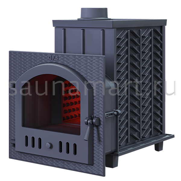 GFS-ЗК 40 (М) - печь с усиленной каменкой большей массы, с единым углублением внутрь топки для дополнительной укладки чугунного заряда. Теплосъемные шипы, со стороны горения пламени, в разы увеличивают площадь соприкосновения огня с каменкой и ускоряют передачу тепла, а также способствуют лучшему дожигу, смешивая потоки пламени и воздуха, поступаемого из воздушника. Эти усовершенствования значительно повышают мощность парообразования печи и выдают большее количество пара при непрерывной подаче воды. Каменка печей GFS-ЗК является незаливаемой.