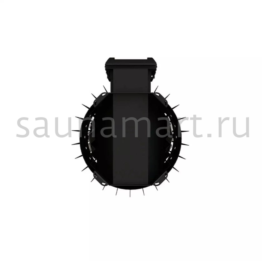 Камни укладывают по периметру печи в стильную металлическую сетку, они защищают от инфракрасного излучения. Звук вьюги при подаче воды.