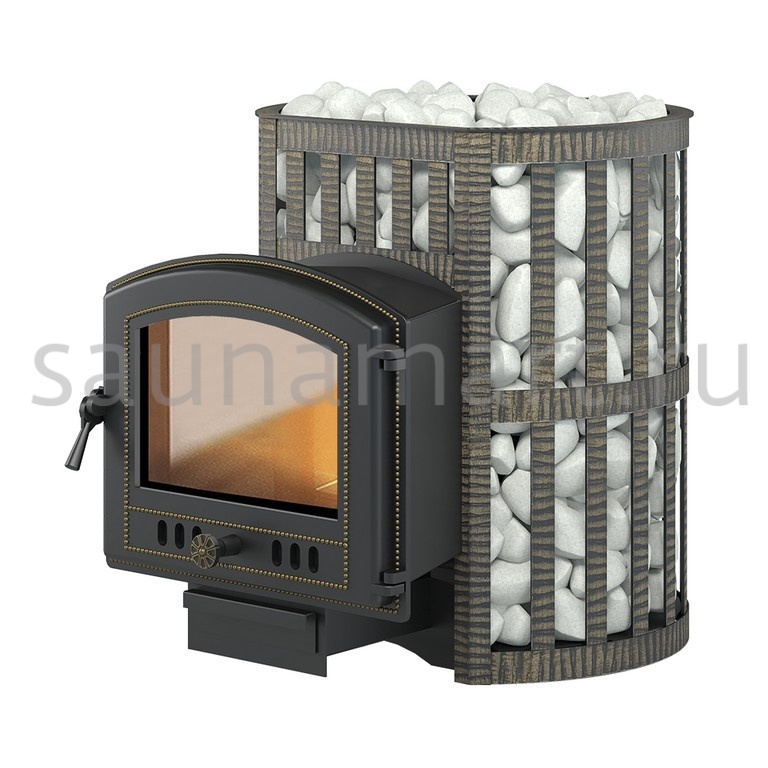 Банная чугунная печь Легенда Ковка 22 (224) укомплектована чугунной герметичной дверцей Везувий 224 с жаропрочным стеклом «SCHOTT ROBAX». Конвекционно-вентилируемый кожух "Ковка" изготовлен из металлической текстурированной полосы, покрашенной термостойкой краской и покрытой патиной «Бронза».
