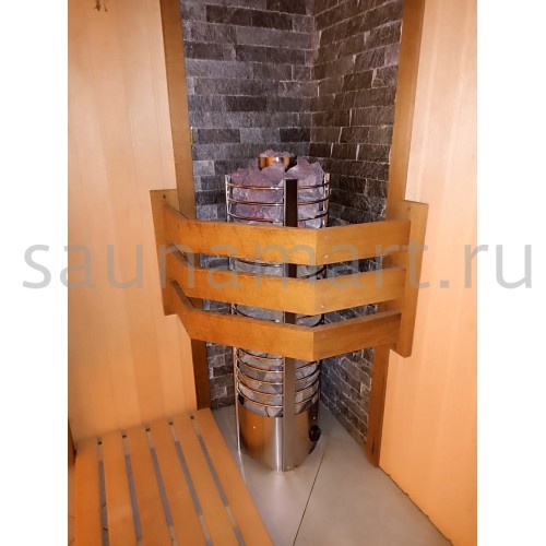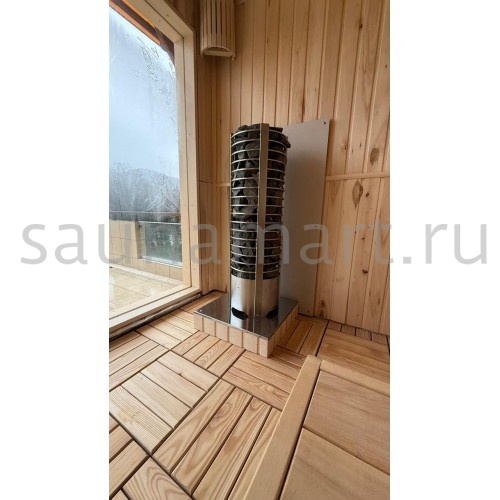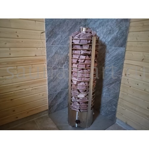 Печь комплектуется выносным пультом управления с 5-метровым кабелем. Нагревательные элементы (ТЭНы) изготовлены из нержавеющей стали AISI 304. Вариант размещения - напольный, требует монтажа на негорючее основание. Каменка открытого типа с верхней загрузкой. Имеется встроенный пароиспаритель с механическим клапаном регулировки пара. Дополнительно: защита от перегрева и система аварийного отключения.
