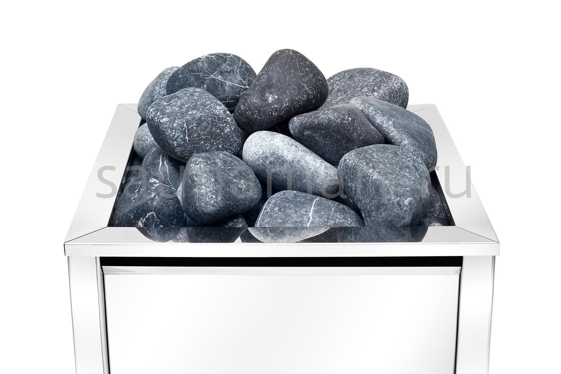ТЭН из специальной нержавейки обладает повышенной электробезопасностью и большой тепловой инерцией. Представленная модель электрокаменки имеет отсек для камней, который вмещает до 80 кг. Она монтируется напольно. Электропечь не имеет в комплектации выносного пульта управления, который приобретается отдельно.