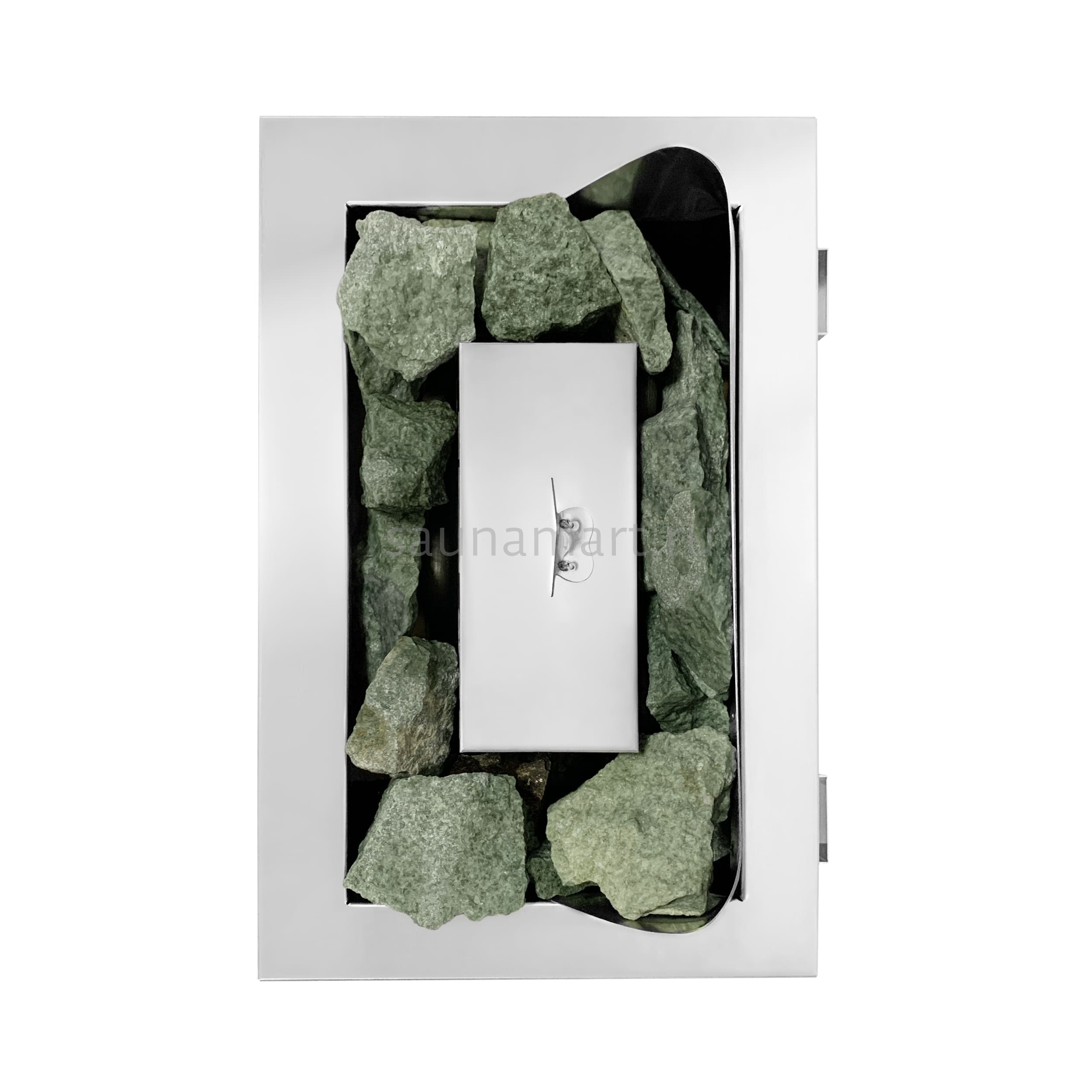 Все корпусные элементы выполнены из нержавеющей стали, лицевая часть печи выполнена из просечного листа для меньшего нагрева и меньшей вероятности получить ожог при соприкосновении с печью. Нагревательный элемент в данной печи ТЭН диаметром 10мм.
