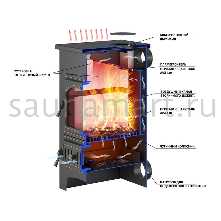 Печь-камин «Везувий ПК-01 (270)» мощностью 9 кВт (обогрев до 150 м3) сочетает надежность и функциональность: корпус из котловой стали 09Г2С, топка с шамотной футеровкой и чугунными дверцами (топочная — с жаростойким стеклом, поддувальная — с регулировкой тяги). Оснащена вторичным дожигом, колосниковой решёткой, керамическими вставками и пламегасителем из нержавейки (2 мм). Дополнительные опции: чугунная варочная плита, подключение вентилятора (ускоренный прогрев), гибкая установка дымохода (сверху/сзади) и модификации с теплообменником. Время горения на одной закладке — до 5 часов.
