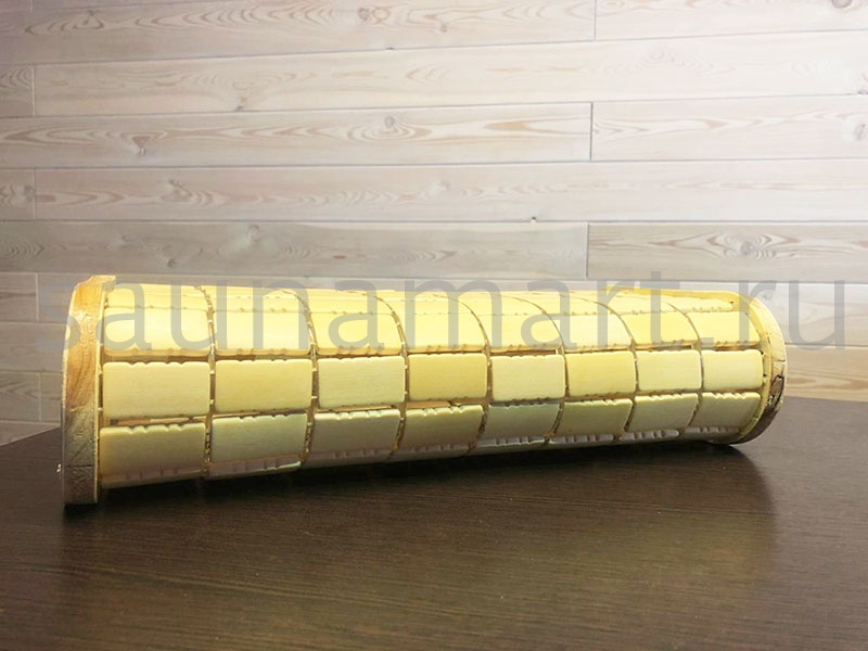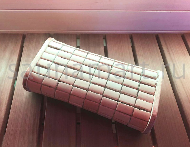 Подголовник выполнен из бамбука, материала, который отличается экологической чистотой, высокой устойчивостью к механическим воздействиям и упругостью. Подголовник позволяет с удобством расположиться на полке во время банных процедур и полностью расслабить тело. При использовании подголовника шея оказывается полностью расслаблена и не испытывает напряжения, а голова приподнята, что предотвращает прилив крови к голове, крайне нежелательный в условиях высокой температуры. Подголовник украшен геометрическим орнаментом из светлых и темных участков, которые чередуются между собой.
