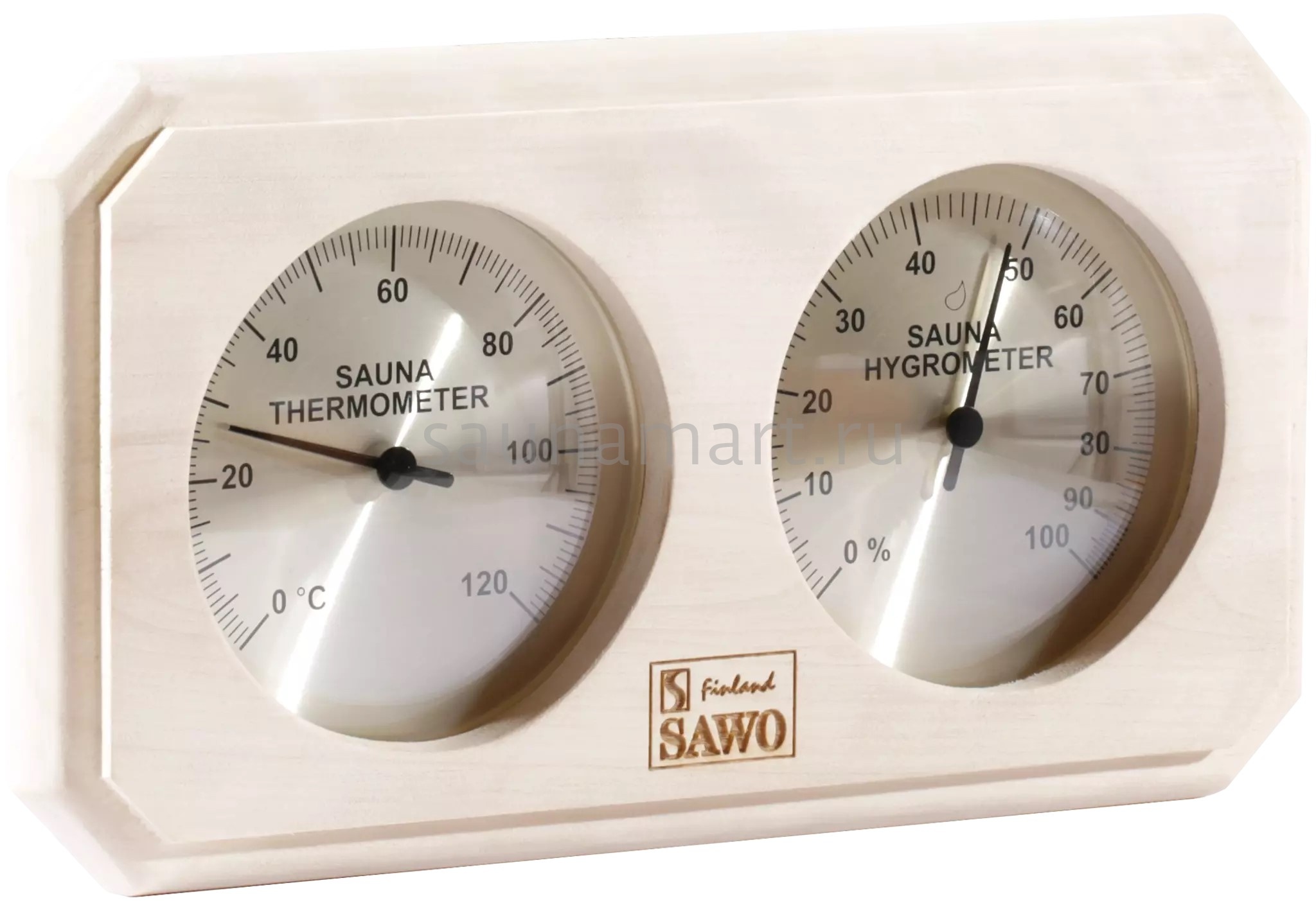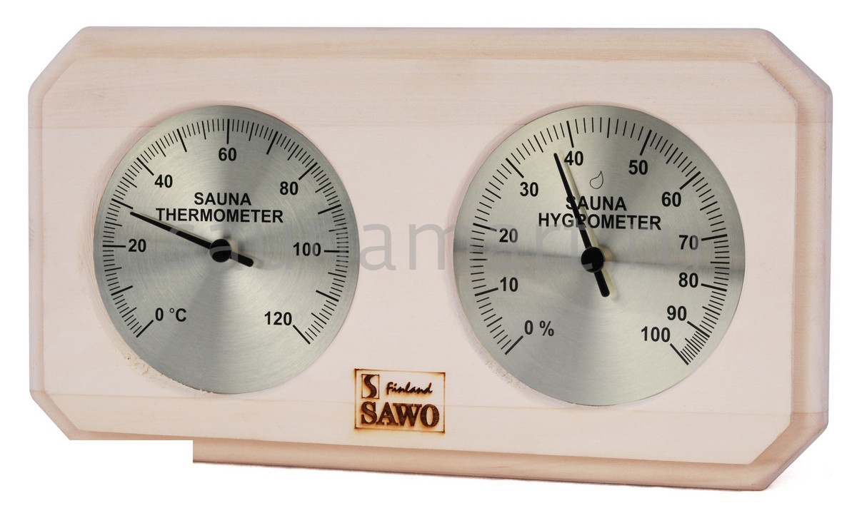 Термогигрометр SAWO 221-THА отличается надежностью, долговечностью и практичностью. Корпус прибора выполнен из осины, очень прочного материала, который не выделяет смолу и не впитывает влагу. В широкой раме из осины находятся два круглых циферблата под термостойким стеклом. Градуировка шкалы гигрометра варьируется в пределах от 0 до 100 %. Градуировка шкалы термометра варьируется в пределах от 0 до 120 градусов по Цельсию. Предусмотрена возможность калибровки прибора. Термогигрометр SAWO прекрасно впишется в интерьер любой бани или сауны и удачно дополнит интерьер. Термогигрометр Саво подойдет для использования в любом парильном помещении, как в условиях русской бани, финской сауны так и хамама. Помните, чтобы проведённое в парной время оказало благоприятный эффект на здоровье и самочувствие, необходимо тщательно соблюдать температурный режим парения и режим влажности. Высокий стандарт качества SAWO гарантирует надёжность и точность измерений термо-гигрометра.