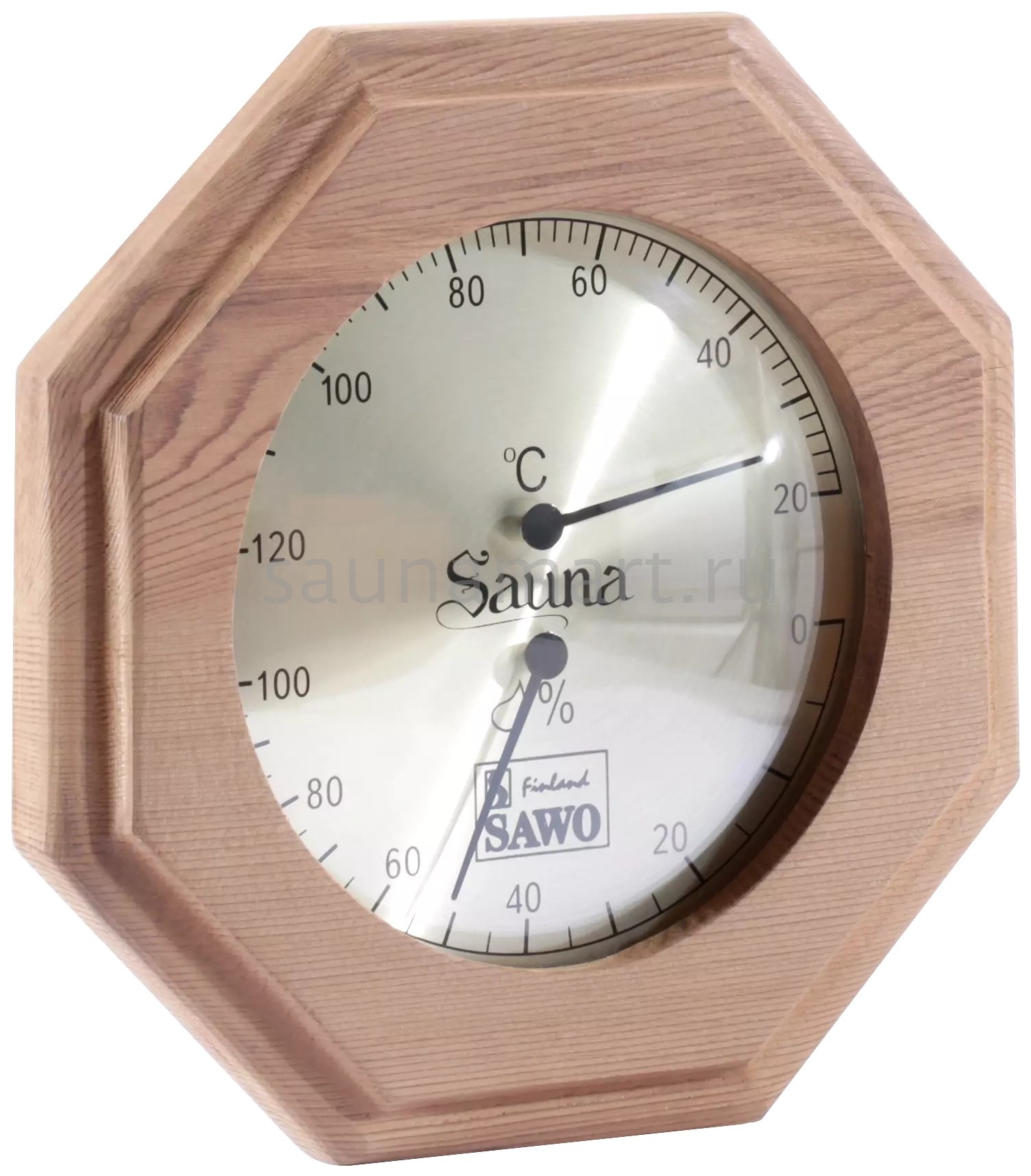 SAWO Термогигрометр 241-THD Измеритель влажности и температуры Sawo в восьмиугольном корпусе отличается надёжностью и долговечностью. Он позволяет одновременно контролировать влажность и температуру в сауне. Корпус прибора выполнен из пиломатериалов лиственных пород(кедр). Термогигрометр впишется в интерьер любой сауны, украсив его. Температурная шкала термометра от 20 до 120 градусов. Размеры, м: 0,165х0,18 Материал: пиломатериалы лиственных пород Производитель: Финляндия