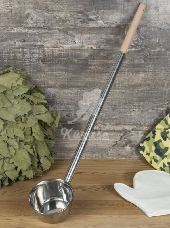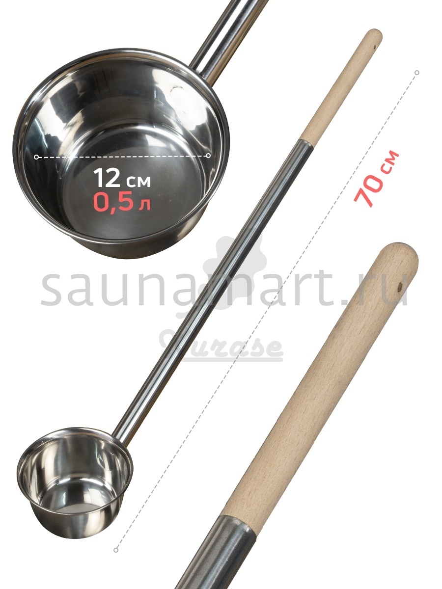Объем 500 мл. Длина банного инвентаря 70 см, диаметр ковшика 12 см. Ручка выполнена и дерева бук, низкой теплопроводности.  Длинная ручка позволит не приближаться к раскаленной печи.  Для максимальной защиты рук от термического воздействия применяйте специальные войлочные рукавицы для бани. Металлическая часть ковша выполнена и полированной нержавеющей стали, что придает ковшу эстетичный внешний вид и предотвращает образование ржавчины, что значительно увеличивает срок службы изделия.