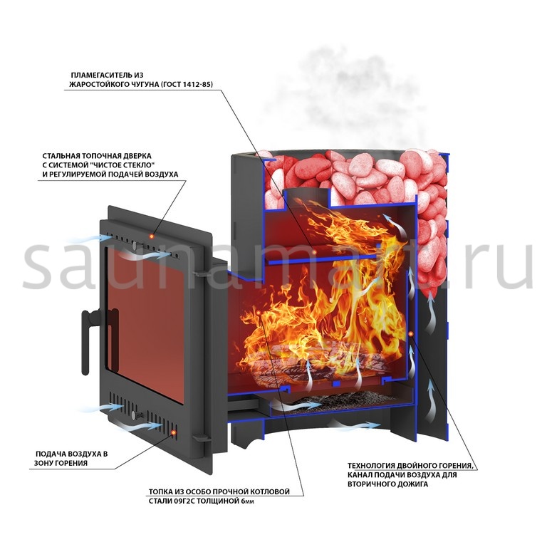 В печи обеспечен дожиг вторичных газов посредством широкого П-образного профиля на задней поверхности топки, который, доставляя воздух в зону активного горения, увеличивает КПД печи и дополнительно усиливает заднюю стенку печи.