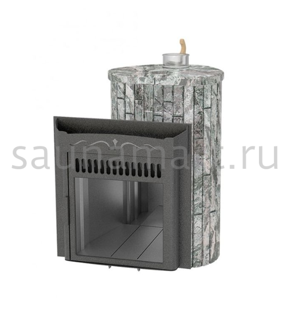 Портал "Оптима мини" из наборного жадеита от Ферингер — элегантное решение для декоративного оформления банной печи. Натуральный камень создает гармоничный переход между металлической дверцей и деревянной отделкой помещения, превращая печь в стильный элемент интерьера.
