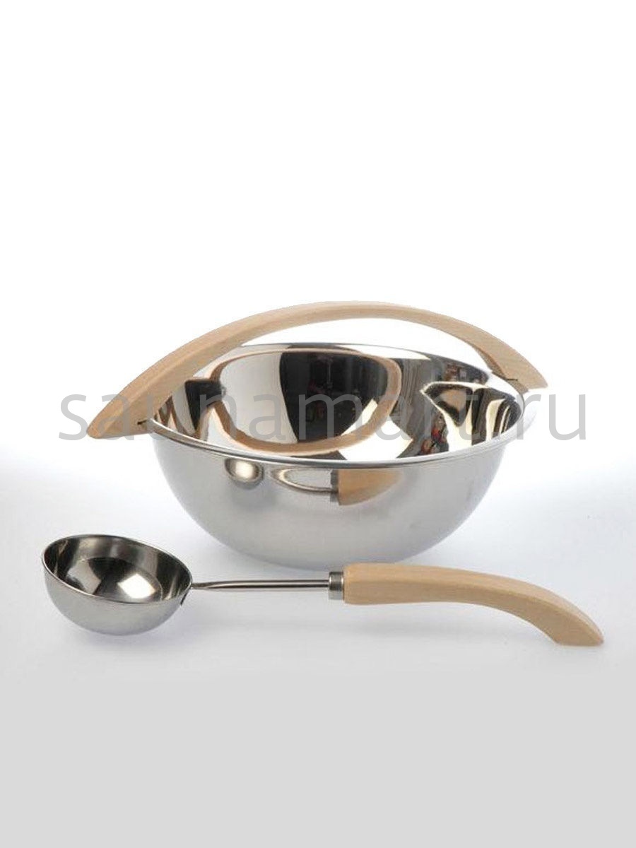 Чаша из нержавеющей стали – это незаменимый при проведении банных процедур аксессуар. В него набирают воду с тем, чтобы потом зачерпывать ее ковшом и подливать на камни, получая большое количество пара. Емкость изготовлена из нержавеющей стали, что позволяет ей не бояться контактов с водой и высокими температурами. Материал, из которого изготовлена емкость, не подвержен коррозии при контакте с влагой. Чаша оборудована деревянной ручкой, которая позволяет комфортно и безопасно ее перемещать. Для безопасности и сохранности камней рекомендуется подогревать воду, используемую для получения пара. Вместимость чаши составляет шесть литров.